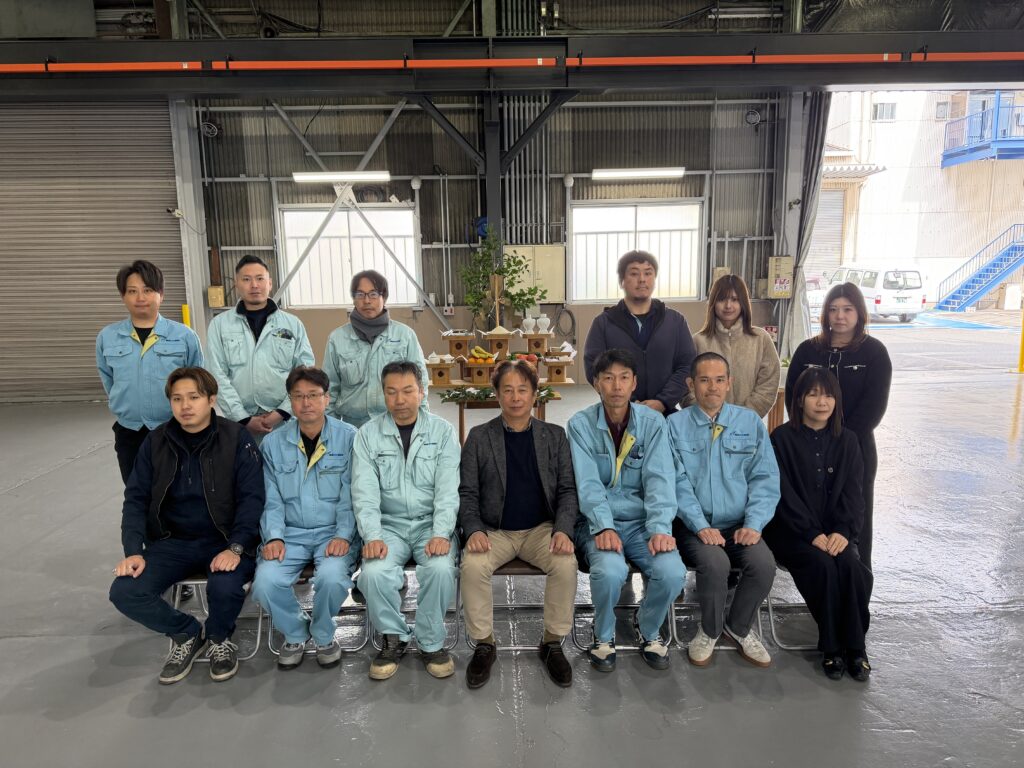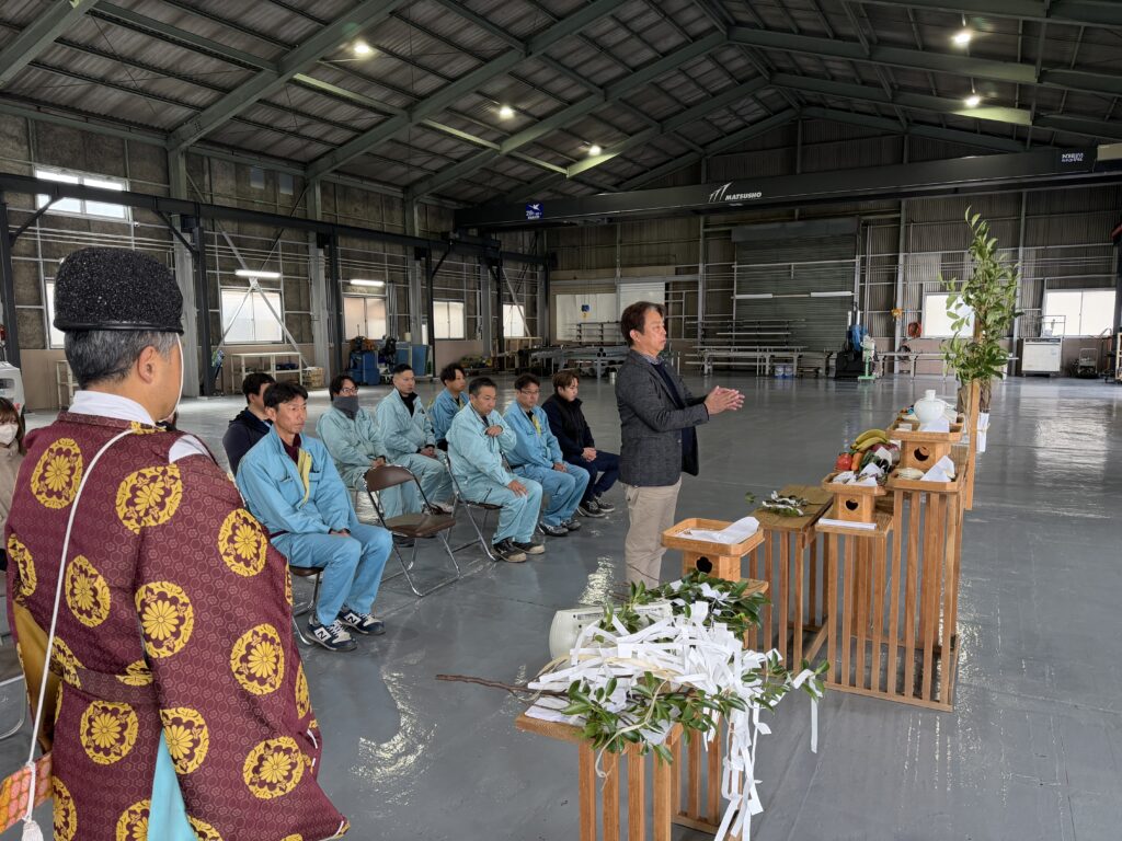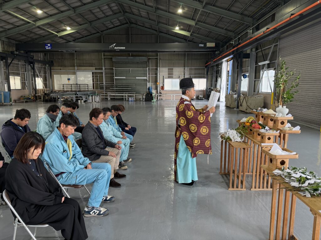 福田神社の宮司さんに来ていただき、産土神へ工事が無事終わったことへの感謝を表し、朝日に照らされ、夕日に輝く工場であるように祈りを捧げました。